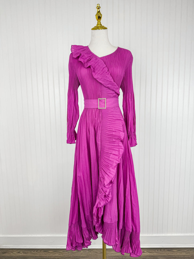 This elegant dress features a finely pleated bodice, long sleeves with soft ruffled cuffs, and a cascading ruffle down the front that flows into an asymmetrical hem. A matching belt with pearl detailing completes the look with a timeless glamorous touch!
